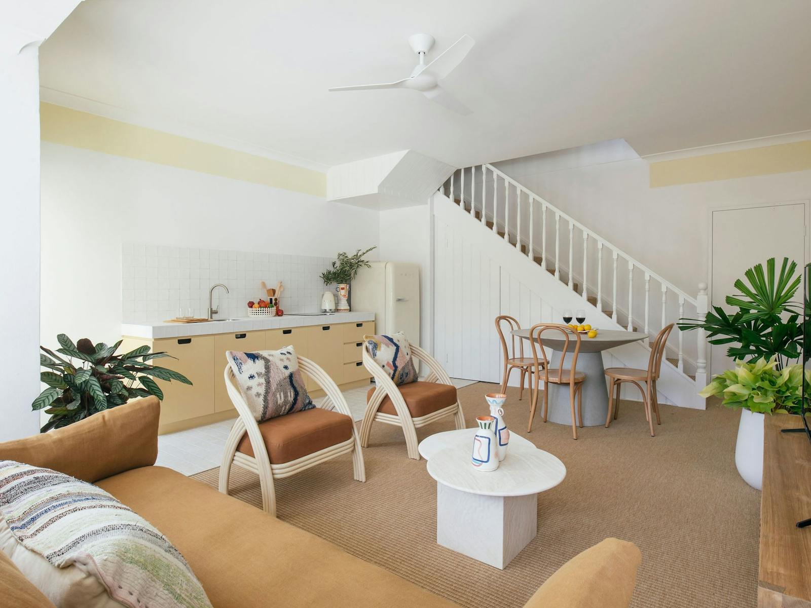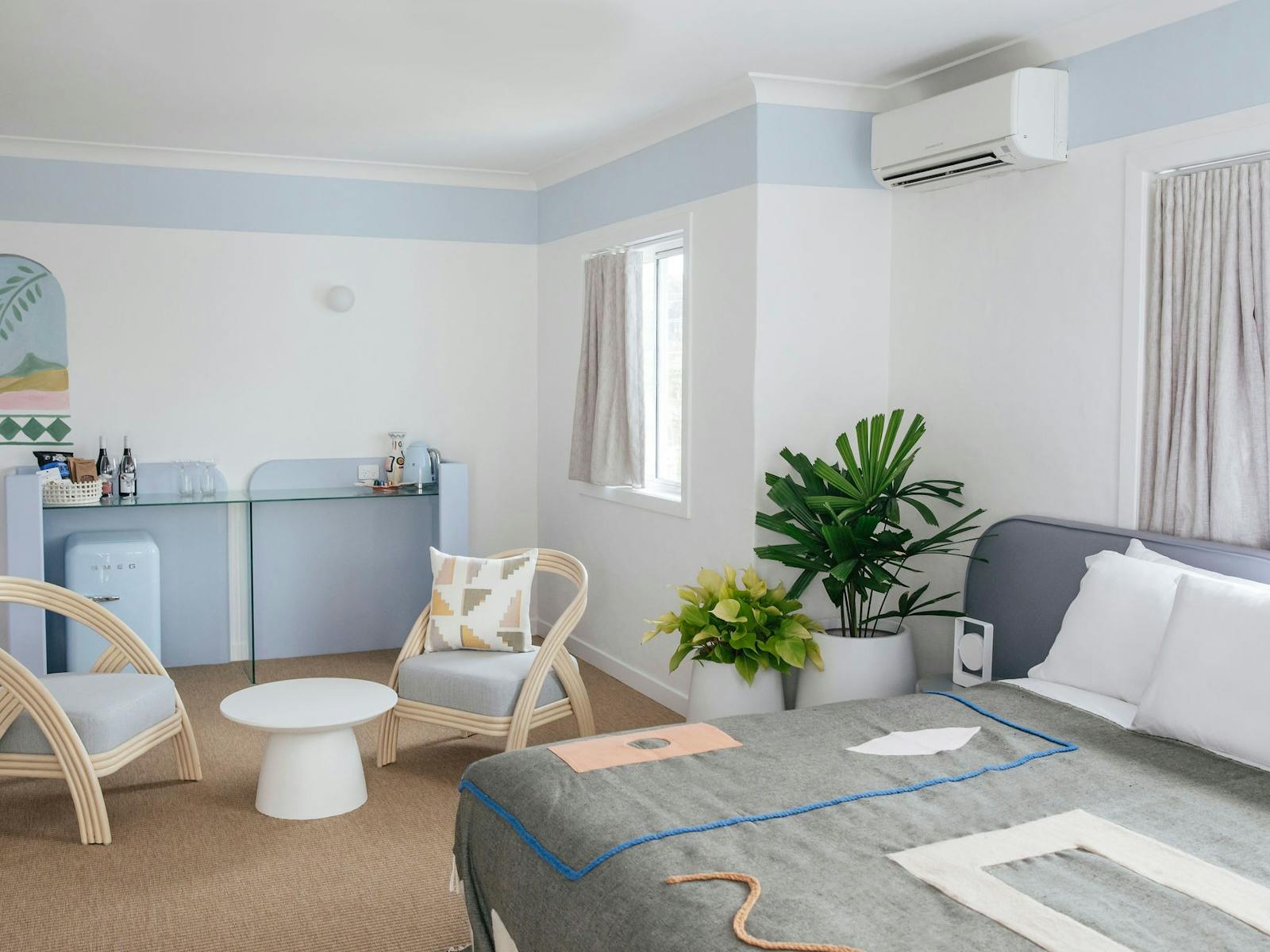 The original retro style of this oceanside motel has been revamped with a Mediterranean-inspired look to create a relaxed retreat. Curated with handmade ceramics, mosaic tiling, local artwork, sunken bathtubs, and pastel-painted walls, this Mollymook escape on the beautiful South Coast is a luxe update on a classic beach motel. Rooms range from one-bedroom king suites to a three-bedroom, split-level apartment with views of the pool, ocean or garden.
